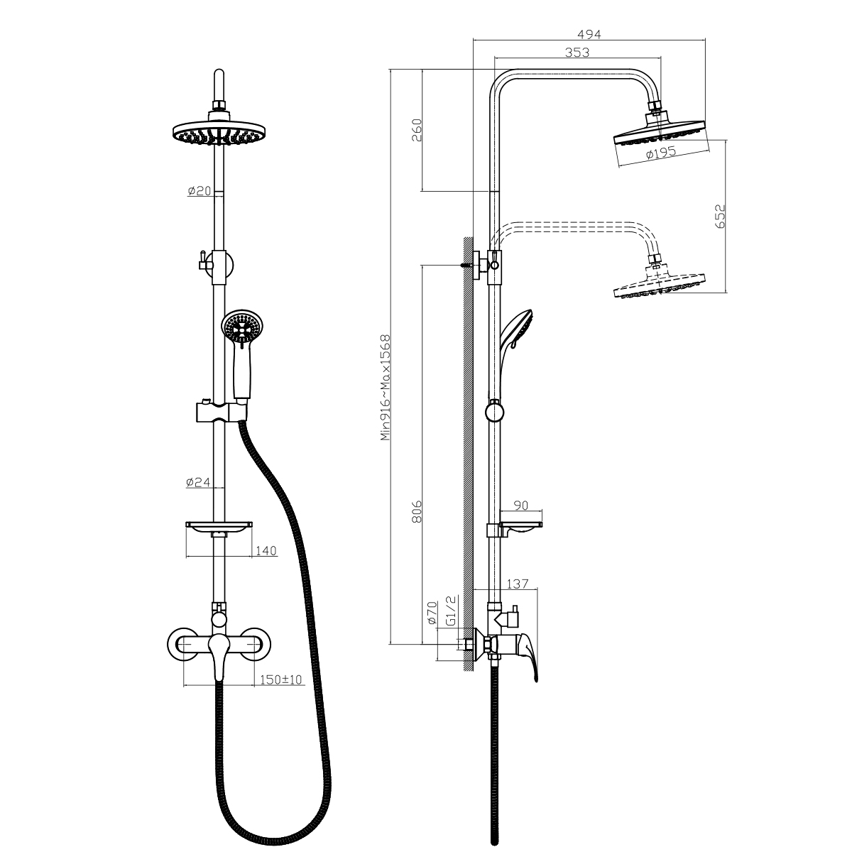 —Душевая система со смесителем (штанга, ручной переключатель, 3-функц.лейка, верхний душ, шланг) RoSSinka