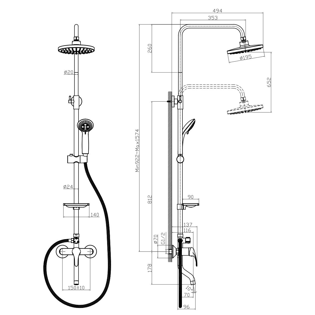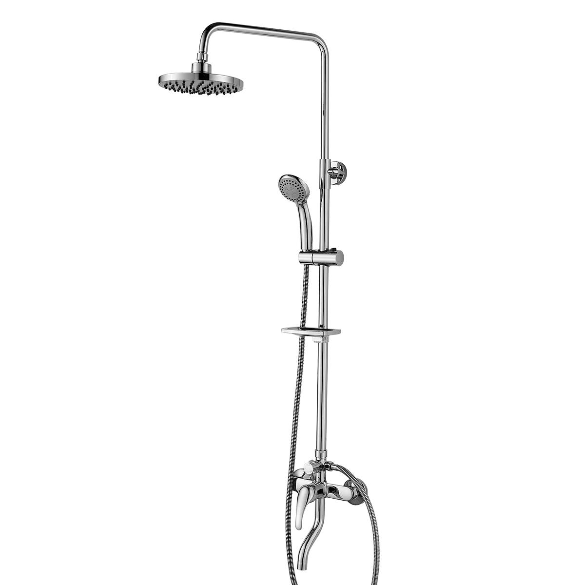 —Душевая система со смесителем, поворотный излив 70мм (штанга, ручной переключатель, 3-функц.лейка, верхний душ, шланг) RoSSinka