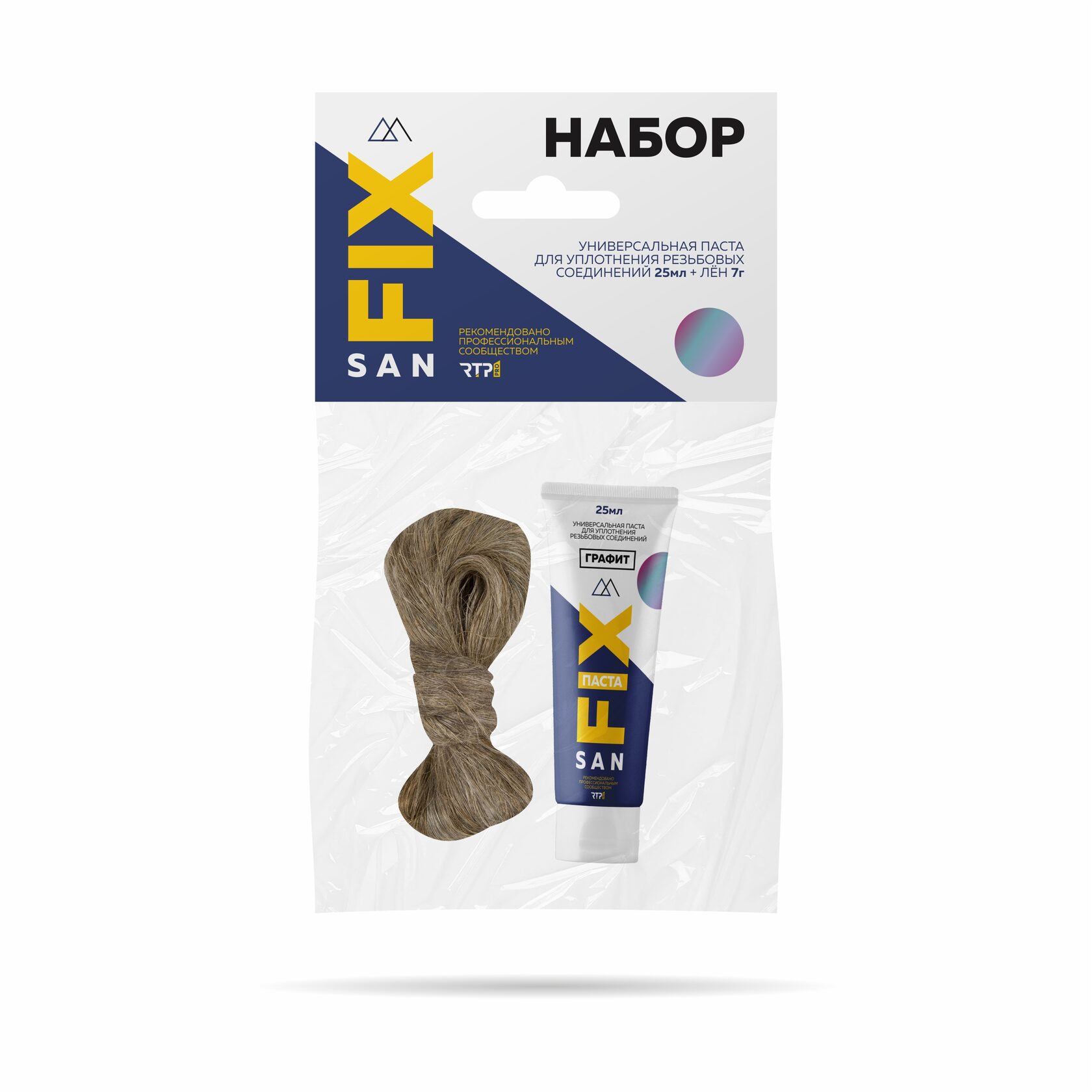 Набор монтажный: универсальная паста для уплотнения резьбовых соединений + лен (25мл+7гр), в тубе, графит, SANFIX