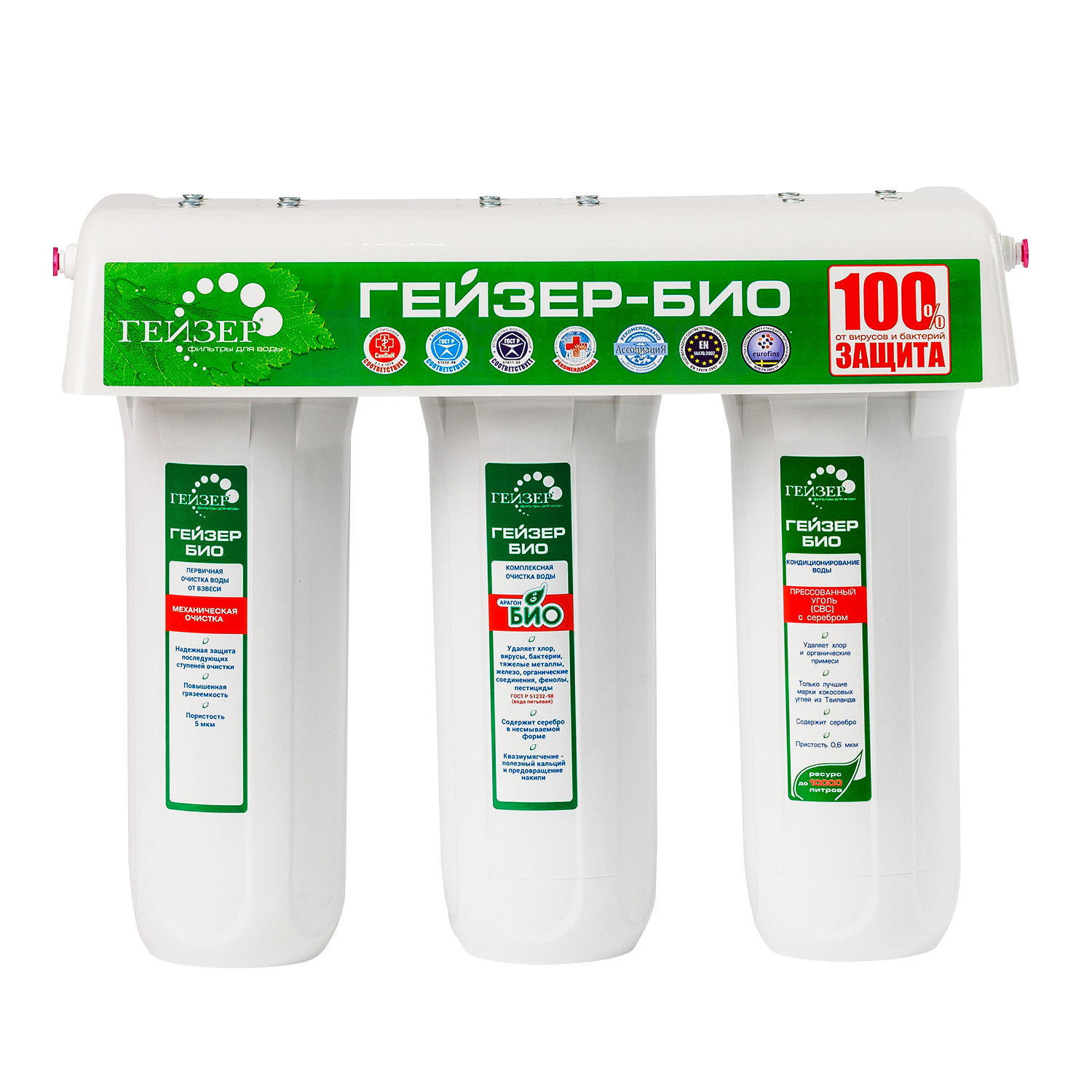 Благодаря запатентованной технологии «электросорб» фильтры Гейзер-Био полностью удаляют из воды вирусы и бактерии. На сегодняшний день это — единственный материал в России и Европе, обладающий подобными свойствами. Его эффективность неоднократно доказана ведущими российскими и европейскими исследовательскими центрами, в том числе Институтом Пастера (Франция). Фильтр Гейзер-БИО прост в установке и обслуживании — поменять фильтрующие картриджи очень легко. Корпус выполнен из пищевого пластика и выдерживает давление, в шесть раз превышающее рабочее. ЭТАПЫ ОЧИСТКИ ВОДЫ ФИЛЬТРОМ ГЕЙЗЕР БИО: Полипропиленовый модуль PP, 10"SLIM - Механическая фильтрация Арагон-Ж БИО - Квазиумягчение (Удаление солей жесткости по классическому механизму ионного обмена) Картридж из углеродного волокна ММB - 10SL / Fiber Pro - 10SL - Сорбция (Удаление хлора, фенолов, органических и хлорорганических соединений, неприятного вкуса и запаха) Важным свойством является самоидикация – фильтр сам подскажет, когда пришло время менять картриджи (уменьшение напора в кране для чистой воды). Замена фильтрующих картриджей в среднем 1 раз в 18 месяцев.