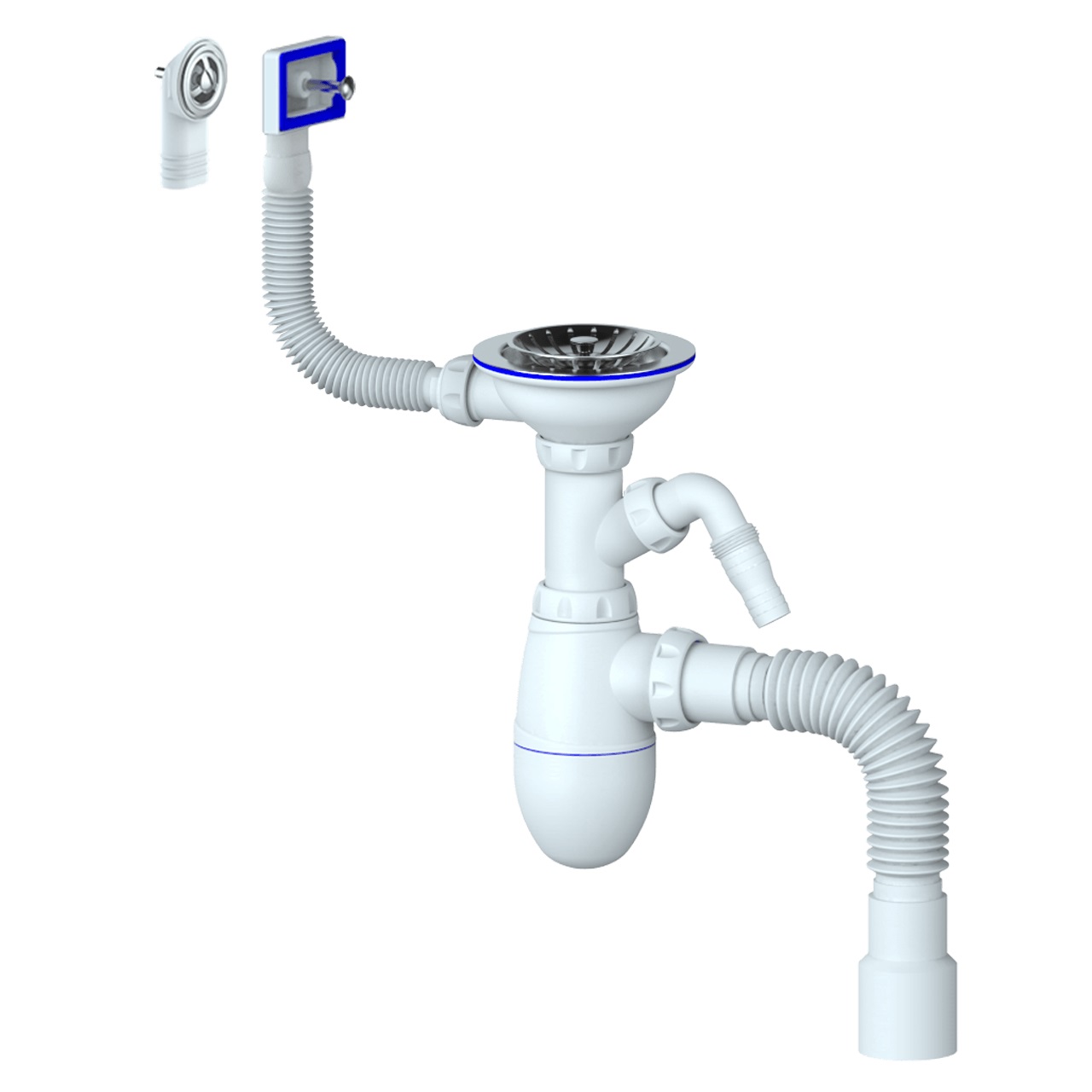 —Сифон для мойки с нержавеющим выпуском 3"1/2, круглым и прямоугольным гибким переливом, отводом для стиральной/посудомоечной машины и гофрированным сливом Unicorn