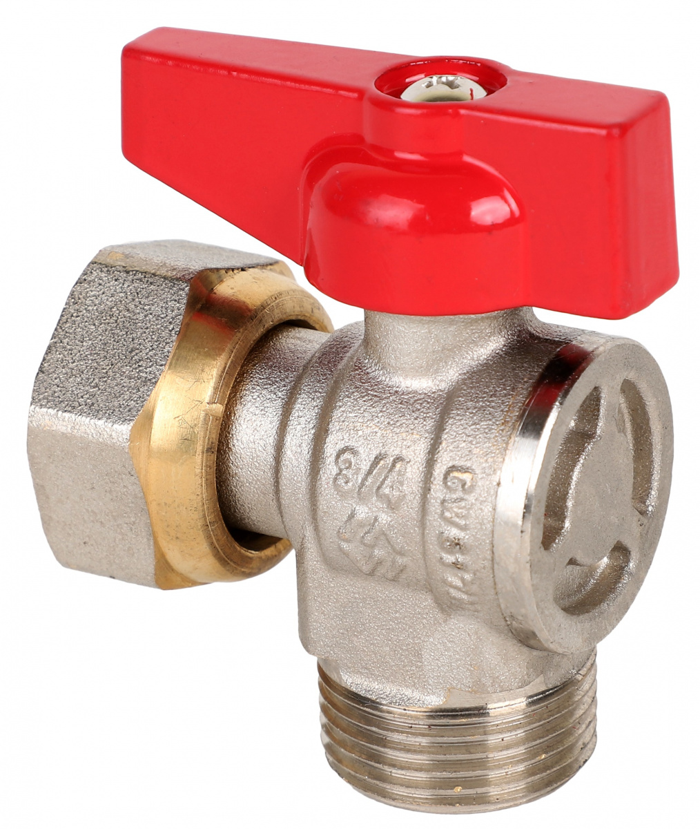 —MVI Кран шаровый латунный Ду15 угловой, с накидной гайкой, внутренняя-наружная резьба, полнопроходной с ручкой-"бабочкой", Tmax=120С, Ру25